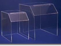 1/2" clear cast acrylic floor waste containers, with lift-off pivoting cover and 3/4" overhang handle. 16"x 16"x 21" tall inside dimensions. Holds your LSA box or standard size 14" x 14" x 20 " cardboard box, wih 32 gal., disposable plastic bag. Can be fitted with lock
